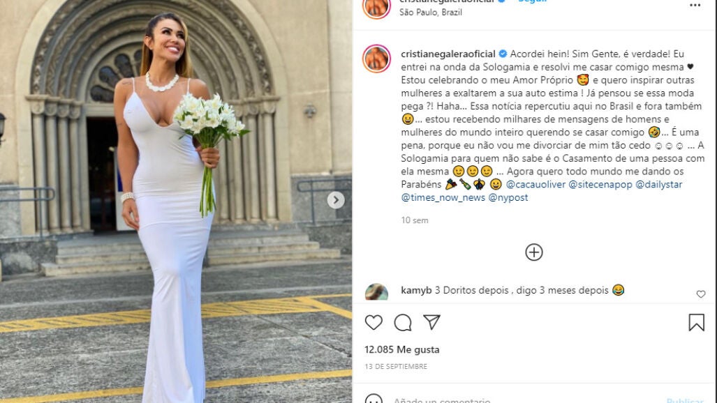 La modelo e influencer brasileña Cris Galera, de 33 años, se volvió viral en todo el mundo a mediados de septiembre cuando contrajo matrimonio consigo misma a las afueras de una iglesia católica en Sao Paulo. Entonces aseguró que lo hacía en nombre del "amor propio" pero tres meses despuñes las cosas han cambiado.