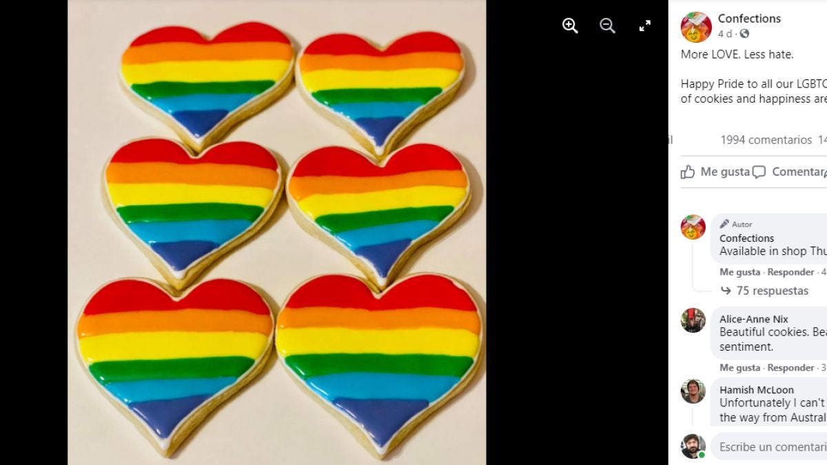 La panadería Confections en Lufkin, Texas, EE. UU. Publicó una imagen de deliciosas galletas en forma de corazón con un colorido glaseado que imita un arco iris, que son los colores de la bandera LGBTQ +. La panadería quiso expresar su apoyo a la comunidad y difundir el mensaje de amor.