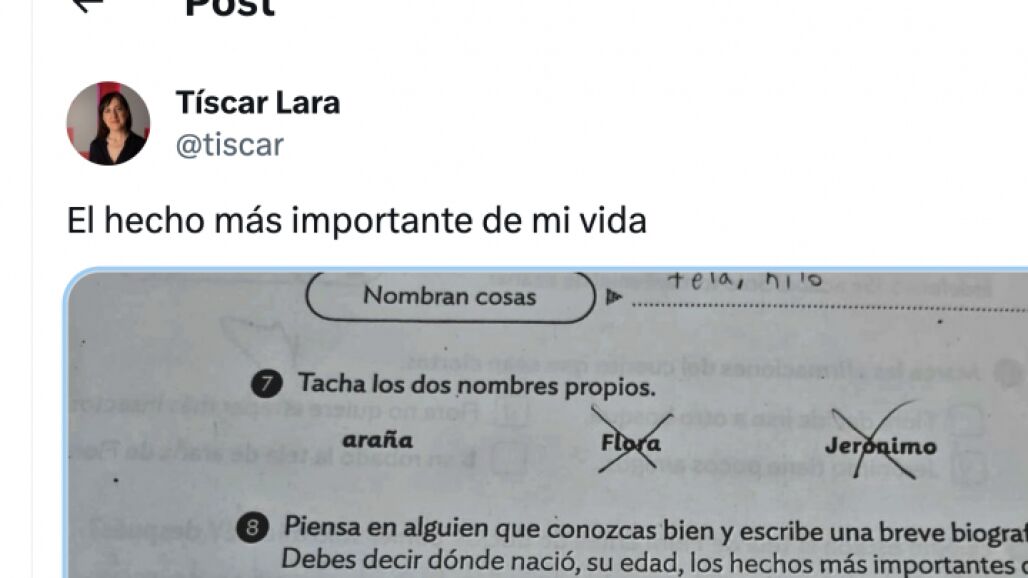 Le piden que piense en alguien que conozca bien y que escriba una breve biografía de ella (dónde nació, su edad, los hechos más importantes de su vida...). Sin duda, el profesor no hubiera imaginado lo que escribiría el pequeño o la pequeña. "Mi madre Tíscar. Tíscar nació en Andalucía, en 1974. Se crió en Heras, Santander. Tiene 49 años y ella dice que el hecho más importante de su vida es tenerme a mí".