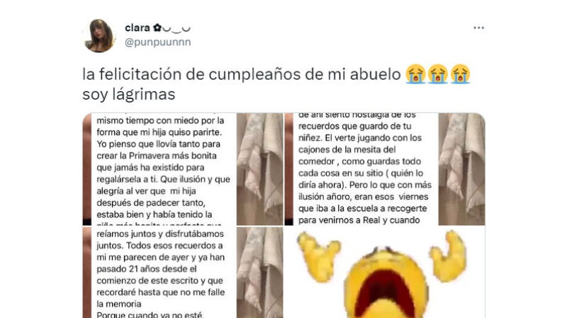 Una muestra de esa relación especial es la que ha mostra una tuitera llamada Clara al compartir el mensaje tan conmovedor que le ha escrito su adorable abuelo con motivo de su 21 cumpleaños.