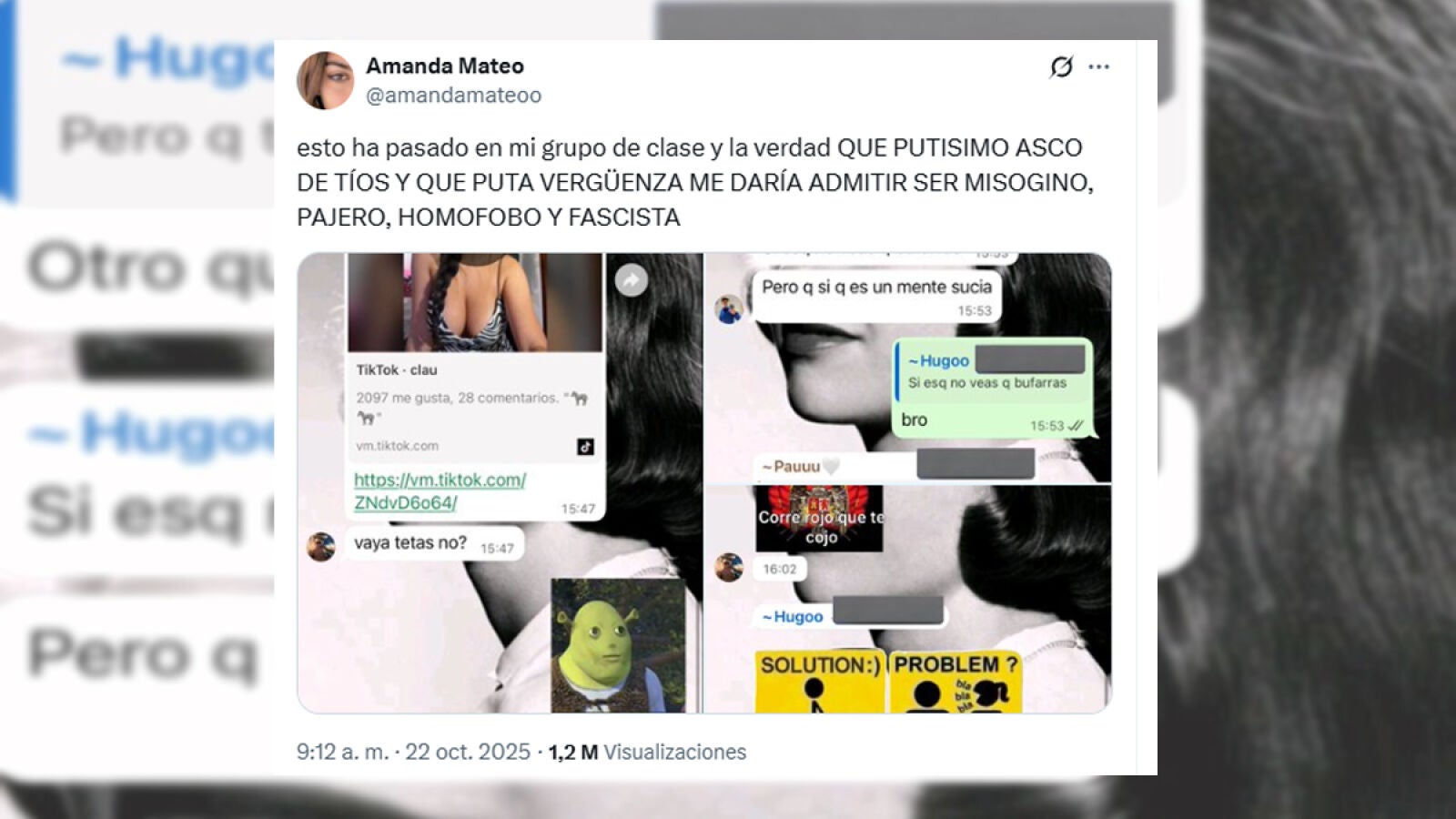 Una de ellas decidió hacer pública la situación publicando una captura de pantalla en la red social X, donde escribió: "Esto ha pasado en mi grupo de clase y la verdad qué putísimo asco de tíos y qué puta vergüenza me daría admitir ser misógino, pajero, homófobo y fascista".