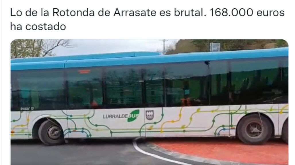 Pero, en lo que al diseño respecta, hay ideas que acaban resultando más prácticas que otras que, por el contrario, se convierten más bien en un engorro para los conductores. Un buen ejemplo de ello es la rotonda recién estrenada en la localidad de Mondragón/Arrasate, tal y como han manifestado algunos usuarios en redes sociales. Y así se ve en el vídeo que ha colgado en Twitter un usuario, donde aparece un autobús urbano atravesando, literalmente, la glorieta. El vídeo publicado en Twitter se ha hecho viral y lleva ya más de un millón de reproducciones.