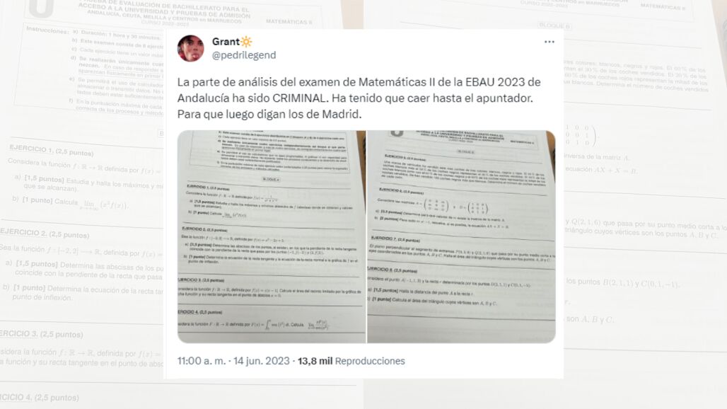 Pero, tristemente, hay veces en las que la suerte no los acompaña y termina cayendo precisamente uno de los temas que habían descartado, algo que acaba perjudicándoles gravemente a la hora de hacer el examen. Y, por lo que parece, esto es lo que ha ocurrido a algunos de los que se han presentado al examen de Matemáticas II en la EBAU de Andalucía. Tras finalizar este examen, muchos de los estudiantes han acudido a las redes a desahogar su frustración y buscar el entendimiento que solo pueden darle los otros examinados, momento en el que han descubierto que muchos de ellos han salido igual que ellos. Porque, por lo que parece, la mayoría de los que se han presentado han coincidido al señalar que algunos de los ejercicios les ha parecido "criminal" debido a lo difíciles y complicados que eran de resolver.