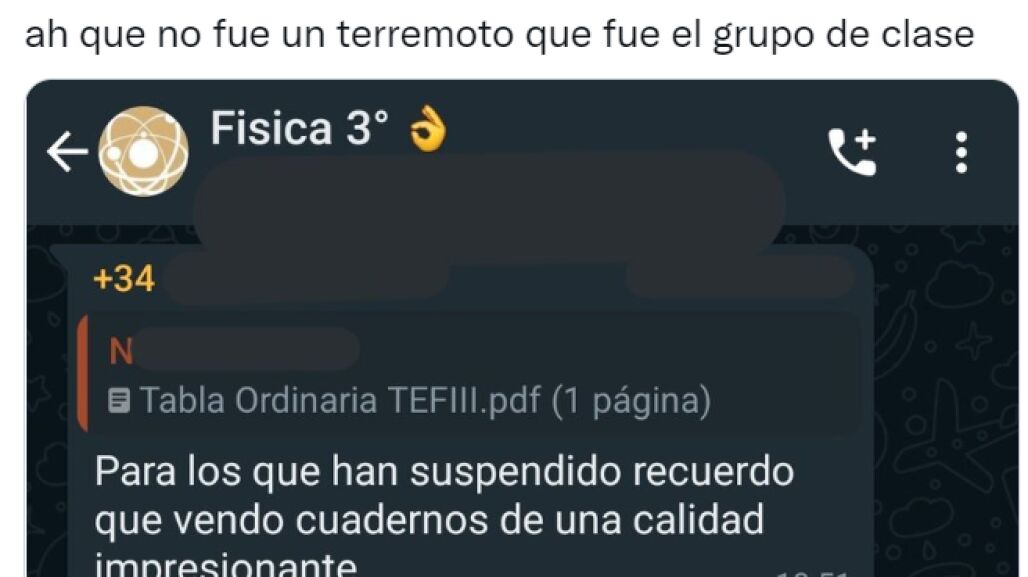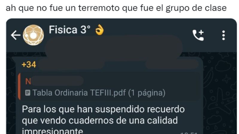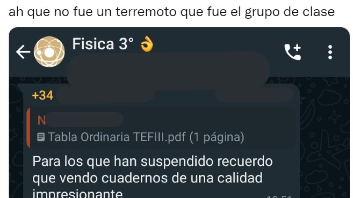 "Ah que no fue un terremoto que fue el grupo de clase", ha escrito Pablo junto a una captura de pantalla de este fragmento de la conversación. En Twitter se ha creado un debate sobre si vender apuntes al resto de la clase o no. El tuitero se ha posicionado con rotundidad: "Para la peña en las respuestas que defiende vender apuntes, tú tienes derecho a venderlos y los demás tenemos derecho a decir que eres una pinche rata. El sistema funciona".