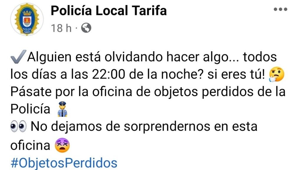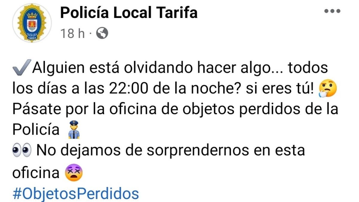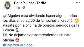 Una ciudadana de Tarifa ha conseguido recuperar su móvil perdido gracias al curioso mensaje que le saltó el pasado sábado a las 22:00 horas de la noche en una alarma planificada. Los agentes no dudaron en publicar a través de sus perfiles oficiales, Policía Local de Tarifa, una imagen del curioso recordatorio que ha corrido como la pólvora por las diferentes redes sociales.