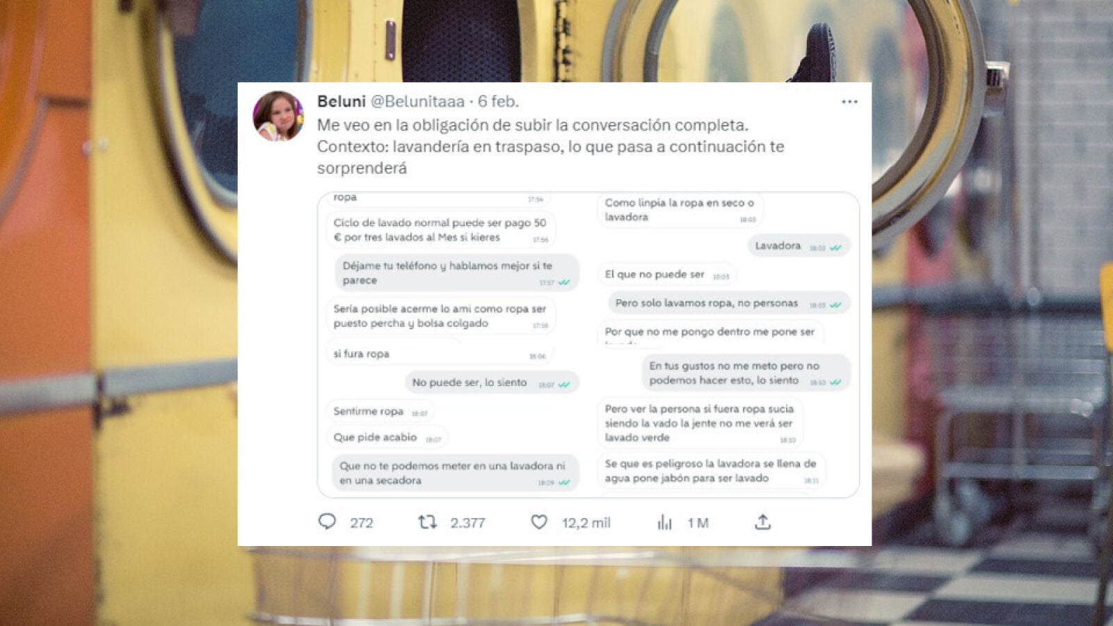Pero la cosa explotó en Twitter cuando Beluni decidió compartir la conversación completa. "Me veo en la obligación de subir la conversación completa. Contexto: lavandería en traspaso, lo que pasa a continuación te sorprenderá", escribió en un segundo tuit que ha sido visto por más de un millón de personas.
