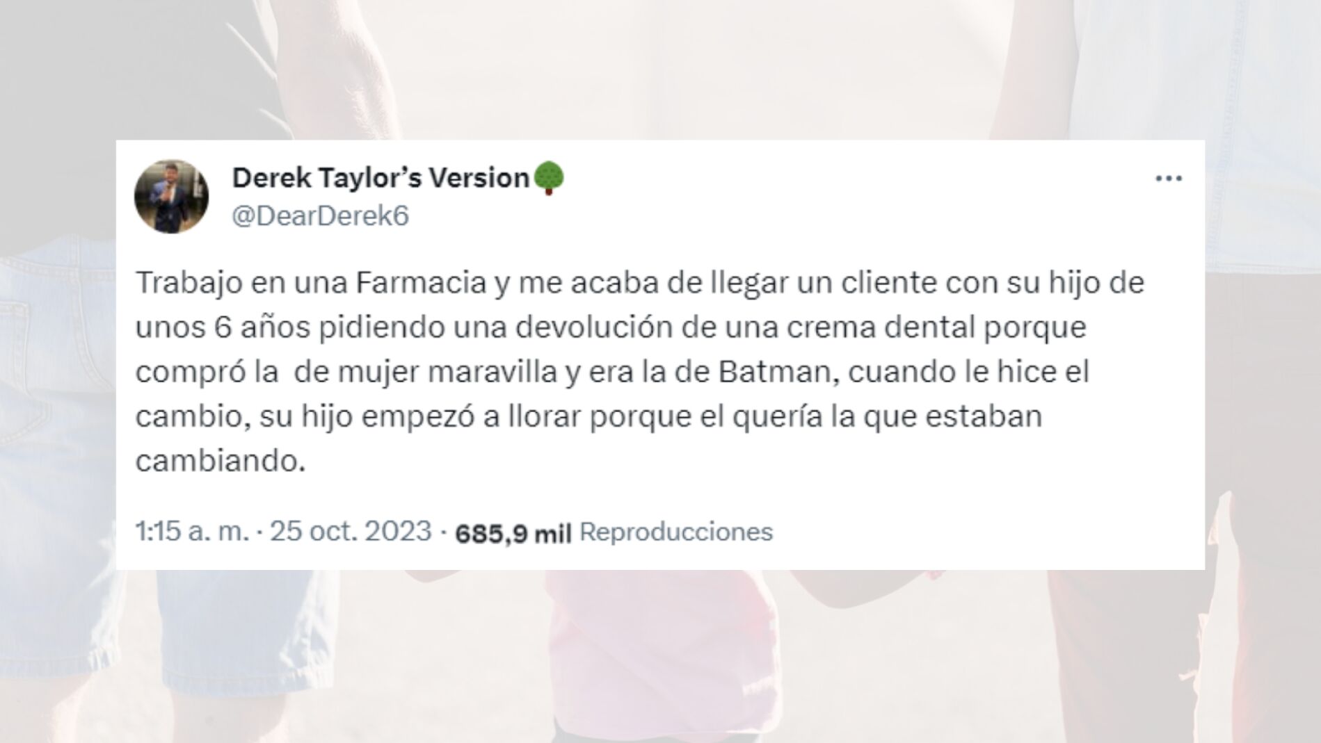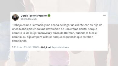 Según le había dicho este hombre, se habían equivocado a la hora de comprarlo porque se habían llevado la de Wonder Woman, pero su hijo en realidad quería la de Batman, algo que el tuitero comprendió y no tuvo ningún problema en hacer el cambio. Pero, justo cuando hizo el cambio, el hijo empezó a llorar, algo que le hizo darse cuenta de que en realidad sí que se habían llevado el que quería el niño, pero su padre quiso cambiarlo porque era la versión femenina, según los estereotipos de género.