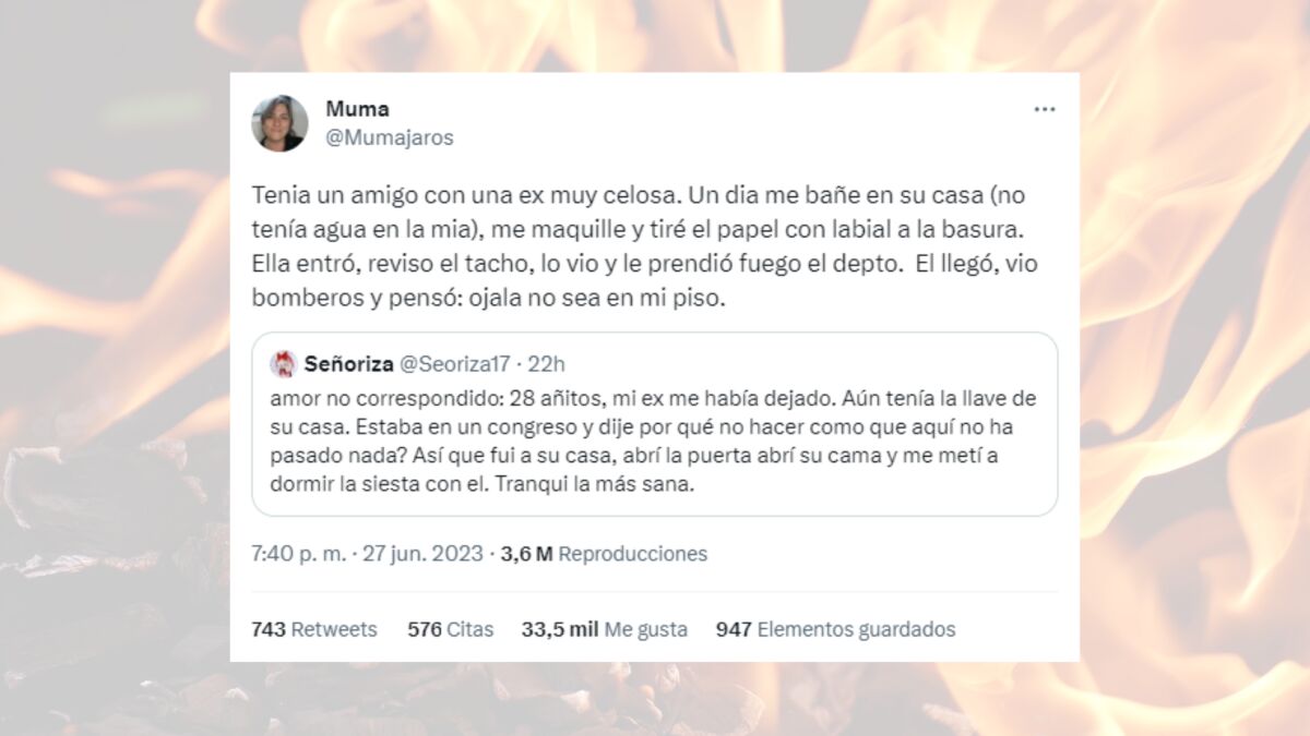 Pese a que la sociedad cada vez está más concienciada sobrelo peligrosos que son los celos y la toxicidad que estos pueden llegar a provocar en una relación, es inevitable que sigan habiendo personas que sufran con este tipo de sentimientos. Y, pese a que muchos de los que los sienten celos tienden a intentar controlarlos, hay quienes prefieren liberar sus emociones y dejarse llevar por ellas, algo que en ocasiones termina provocando historias realmente inesperadas y sorprendentes. Este es el caso de la anécdota de Muma, quien no ha dudado a la hora de compartir lo que tuvo que sufrir su amigo con una de sus ex.
