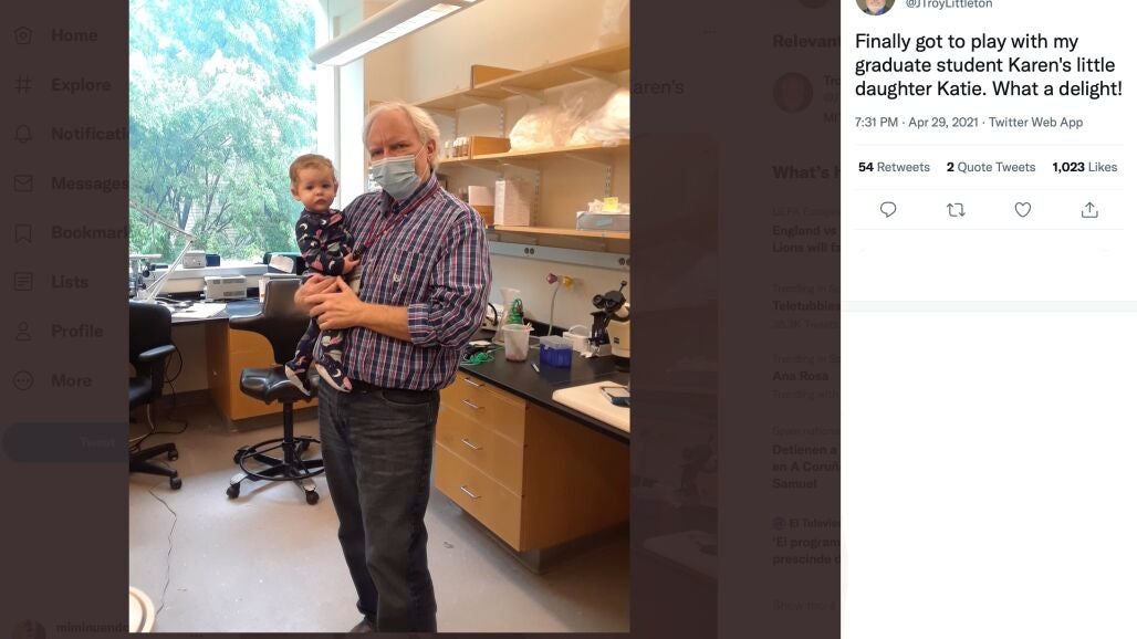Su profesor Troy Littleton, era consciente de la importancia de los estudios para Karen, quien estaba elaborando su tesis. Así que decidió ayudarla colocando una cuna en su oficina de la Universidad para que la madre primeriza pudiera dejar tranquila a su hija mientras realiza sus investigaciones para terminar la tesis. "Mi compra favorita del nuevo equipamiento para el laboratorio: una cuna portátil para llevar a mi oficina para que mi estudiante graduada pueda llevar a su pequeña de 9 meses al trabajo cuando sea necesario y yo pueda jugar con ella mientras su mamá hace un poco de trabajo", compartió Troy en Twitter con la foto de la cuna instalada en su despacho.