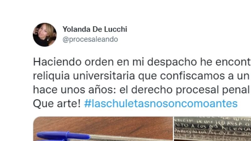 "Haciendo orden en mi despacho he encontrado esta reliquia universitaria que confiscamos a un alumno hace unos años: el derecho procesal penal en bolis bic. Que arte! #laschuletasnosoncomoantes", escribió en un tuit que ha acumulado, en el momento de publicar esta noticia, más de 45.000 'me gusta', 6.000 retuits y 800 comentarios.