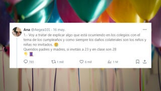 La tuitera y profesora @Aegea101 se ha vuelto viral gracias a un hilo en el que explica el tema de los cumpleaños en los colegio y la problemática de no invitar a todos los niños de la clase.