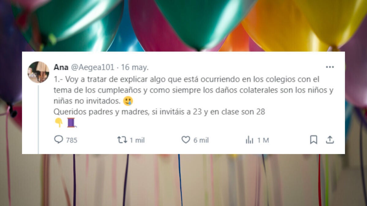 "Voy a tratar de explicar algo que está ocurriendo en los colegios con el tema de los cumpleaños y como siempre los daños colaterales son los niños y niñas no invitados.Queridos padres y madres, si invitáis a 23 y en clase son 28", escribió en el primer tuit de este hilo que ya tiene más de 6.000 'me gusta', 1.000 retuits y más de 700 comentarios.