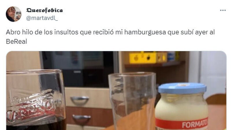 "Abro hilo de los insultos que recibió mi hamburguesa que subí ayer al BeReal", decía en un tuit, junto a la foto de la hamburguesa que había cocinado y subido a la red social, que ha superado 1.2 millones de reproducciones.