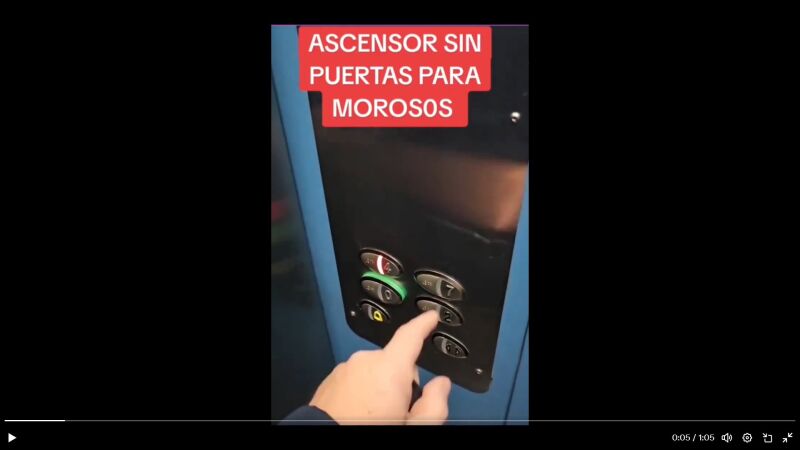 La conocida cuenta de Twitter @LiosdeVecinos ha compartido el vídeo de uno de los vecinos que muestra esta ingeniosa venganza. En la publicación se lee "Ascensor sin puerta para morosos". El vecino que graba el vídeo comenta: "Los del 1º, 3º, 5º y 6º no pagaron en su día instalar este ascensor, pero es que no tienen ni puerta".