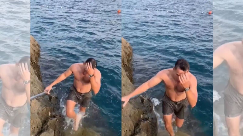 Quiso grabar un vídeo sexy saliendo del agua, pero una señora con ganas de refrescarse le estropeó los planes