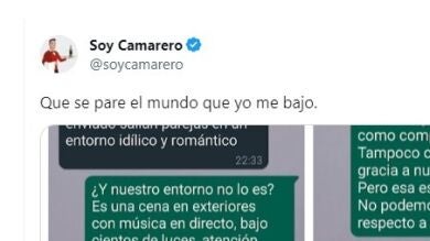 "En las imágenes que has enviado salían parejas en un entorno idílico y romántico", le increpa el cliente. A lo que el empleado le responde: "¿Y nuestro entorno no lo es? Es una cena con exteriores con música en directo, bajo cientos de luces, atención exquisita... no sé todavía cuál es el problema ni ese enfado y en qué hemos fallado".