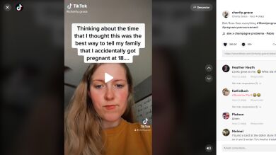 La tiktoker tituló el vídeo "pensando en el momento en que creí que esta era la mejor manera de decirle a mi familia que accidentalmente quedé embarazada a la edad de 18 años". Avergonzada por el recuerdo, procedió a mostrar una pintura de Bob Ross que había editado con Photoshop en la que incluyó una foto de ultrasonido y una prueba de embarazo positiva , con la alegre afirmación, "no hay errores, solo pequeños accidentes felices".
