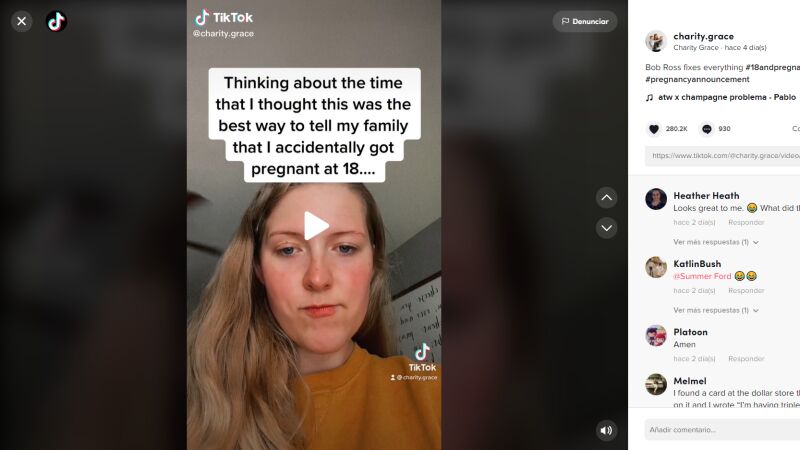 Y es que lo hizo a través de un meme que ella misma creó y que le pasó por móvil a su familia. Charity cogió un meme que ya existía (con el presentador de televisión Bob Ross sonriendo a cámara) y le añadió la imagen de una ecografía y de un test de embarazo positivo. Encima de todo eso escribió "No existen los errores, solo los pequeños accidentes felices", una de las frases del presentador. El vídeo en el que la joven comparte ese meme ha tenido ya más de dos millones de visualizaciones. Además, la publicación sirvió para que otros usuarios contaran casos similares en los que tuvieron que decirle a sus familias que tenían un embarazo temprano. "Le envié a mi papá una foto de la ecografía y le dije: 'Recuerda que siempre sueles decir que cuando tenías mi edad ya tenías 2 hijos'", contaba una usuaria.