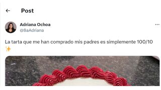 En este caso ha sido la tuitera Adriana Ochoa (@8aAdriana) la que ha tuiteado una foto de la sorpresa que le tenían preparada sus padres por su 25 cumpleaños. "La tarta que me han comprado mis padres es simplemente 100/10", escribió la chica en su publicación.