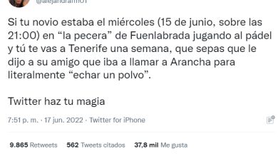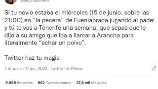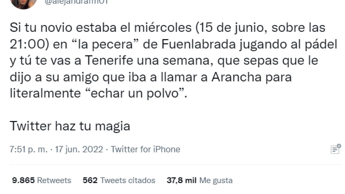 Una usuaria de Twitter llamada @alejandrafm01 ha destapado una infidelidad en redes gracias a la conversación que escuchó entre dos jóvenes desconocidos en la que uno le decía a otro que le iba a ser infiel a su novia mientras ella estuviera de vacaciones en Tenerife. "Si tu novio estaba el miércoles (15 de junio, sobre las 21.00) en ‘la pecera’ de Fuenlabrada jugando al pádel y tú te vas a Tenerife en una semana, que sepas que le dijo a su amigo que iba a llamar a Arancha para literalmente ‘echar un polvo’", sentenciaba Alejandra, mientras añadía: "Twitter haz tu magia".