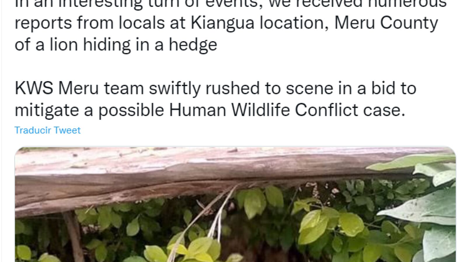 El comunicado oficial de los servicios de emergencia decía: "En un interesante giro de los acontecimientos, recibimos numerosos informes de los lugareños en la localidad de Kiangua, en el condado de Meru, sobre un león escondido en un seto. El equipo del KWS de Meru se apresuró a acudir al lugar para tratar de mitigar un posible caso de conflicto entre humanos y fauna".