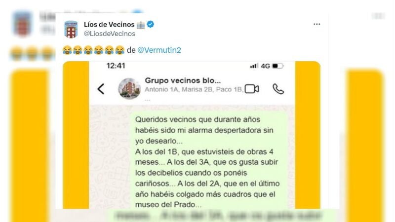 Es el caso que ha compartido la conocida cuenta de X @LiosdeVecinos. Esta vez, afortunadamente, se trata de una cómica historia. Aunque pudiera parecer que haya sido sacado de una película de humor, el mensaje que ha publicado se trata de un caso real. Su autor original, @Vermutin2, ha desvelado el texto que ha decidido enviar por el grupo de WhastApp de sus vecinos.