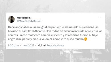 Esto es algo que le ocurrió al padre de Mercedes, una tuitera que ha compartido que hace un año que falleció uno de los amigos de su padre, a quien quisieron despedir lanzando sus cenizas en el castillo de Alicante. Pero, aunque este momento era muy serio para todos, justo en el momento en el que la viuda empezó a tirar las cenizas, vino una ráfaga de viento que provocó que estas fueran a parar sobre el traje de su padre.