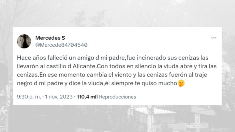 Una tuitera ha compartido la divertida y cálida anécdota que vivió durante el funeral de un amigo de su padre, en el que un cambio de viento provocó que sus cenizas terminaran encima del traje de su padre, una situación que la viuda supo aliviar con un comentario.