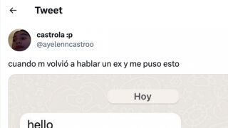 La creadora de contenido @ayelenncastroo ha compartido en Twitter un pantallazo de una conversación en WhatsApp con su exnovio que está triunfando por doble motivo "Cuando me volvió a hablar un ex y me puso esto", comentaba @ayelenncastroo junto a la imagen con el sorprendente mensaje.